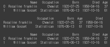 scientists1 = pd.DataFrame({'Name':['Rosaline franklin','William Gosset'],
