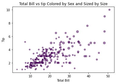 axes1.set_title('Total Bill vs tip Colored by Sex and Sized by Size')