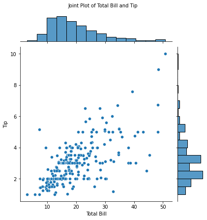 joint.fig.suptitle('Joint Plot of Total Bill and Tip',fontsize=10,y=1.03)