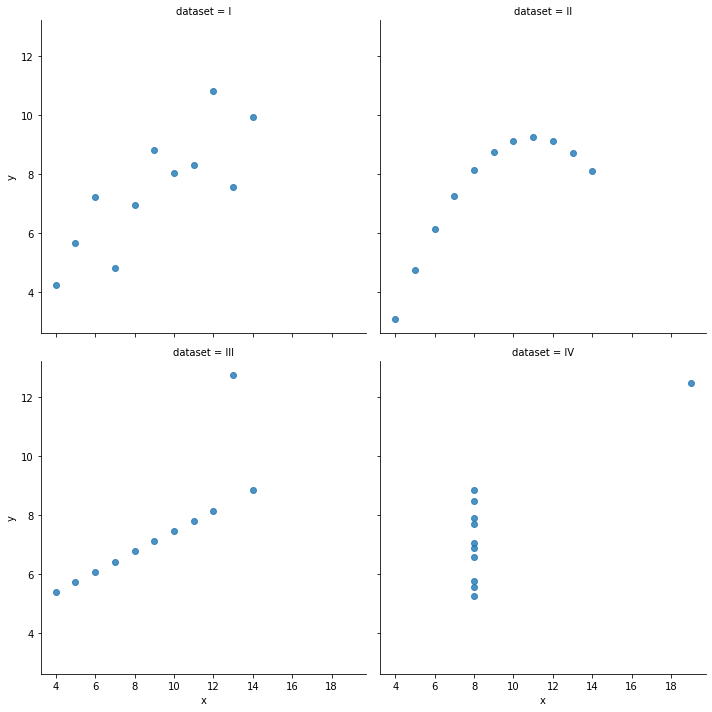 anscombe_plot=sns.lmplot(x='x',y='y',data=anscombe,fit_reg=False,col='dataset',col_wrap=2)
